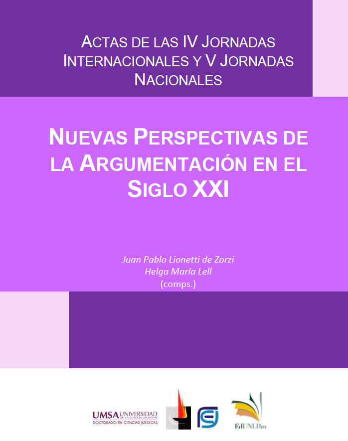 Resumen: Esta obra reúne una serie de trabajos presentados en el marco de las Jornadas “Nuevas Perspectivas de la Argumentación en el siglo XXI”, coorganizadas entre la Facultad de Ciencias Económicas y Jurídicas de la Universidad Nacional de La Pampa y la Universidad del Museo Social Argentino. Durante los días 10 y 11 de noviembre se han reunido investigadores e investigadoras de la temática de diferentes países de Latinoamérica. La obra reúne los trabajos debatidos allí focaliza en los desafíos que se presentan, en particular, al campo del derecho, pero también a la filosofía y a la teoría de la argumentación. Por un lado, se discuten algunas aplicaciones de los autores clásicos en este tema y, por el otro, se presentan posibles aplicaciones respecto de cómo los recursos retóricos se utilizan estratégicamente en el ámbito judicial y profesional.